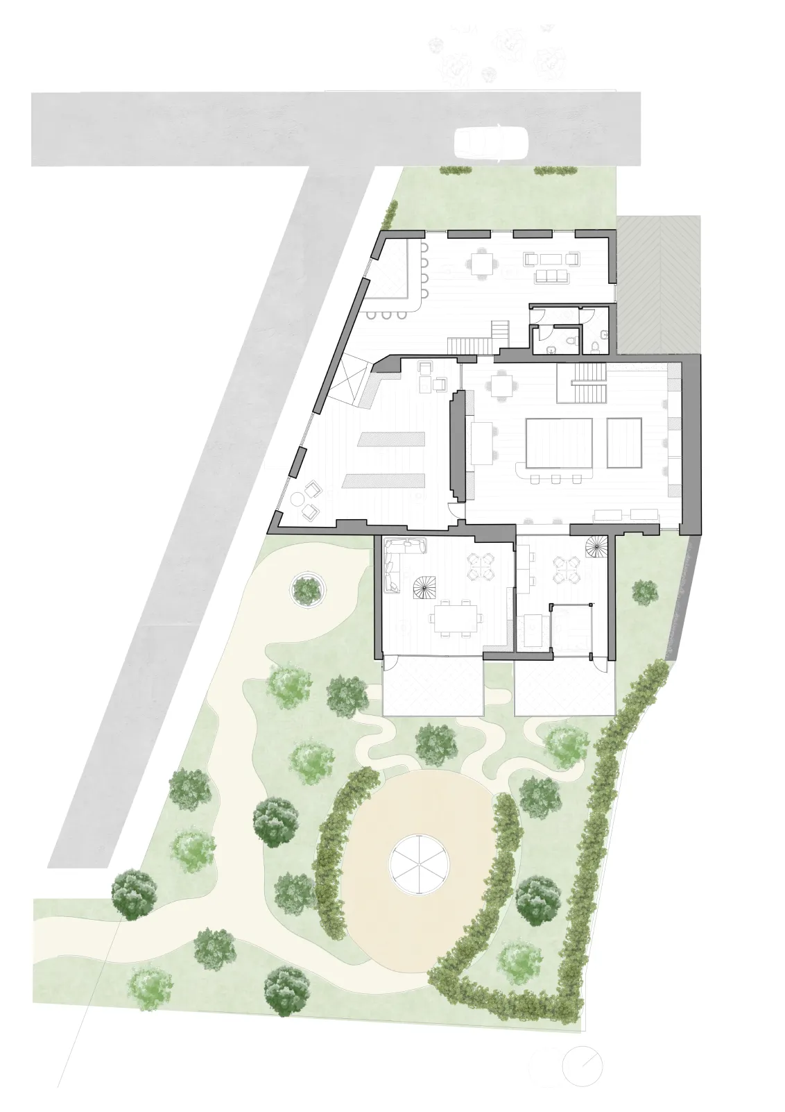 I begin with site mapping to become familiar with the area, working at different scales—one covering the entire town and another focusing on the site and its neighboring houses. Next, I analyze the client to understand their needs and how best to integrate them into the site. I then document the existing structures before developing initial concepts, which I visualize through collages.